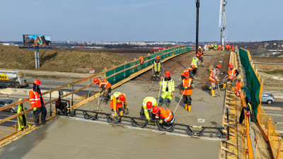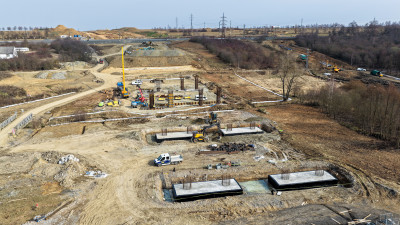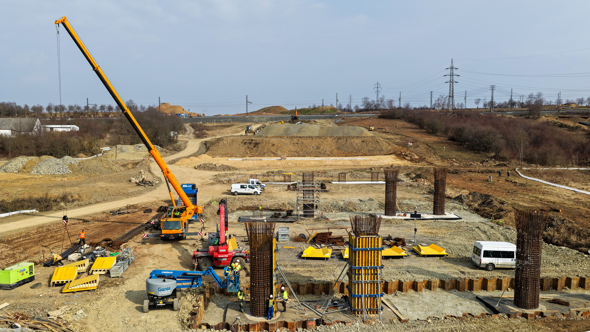 Současně probíhá zakládání a výstavba mostních objektů – vrtání pilot, vázání výztuží, práce na bednění a betonáže.